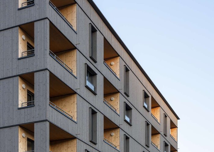 Pro realizaci čtyř dvorů vyvinuli balloon architekten konzistentní designový a materiálový koncept, který se zaměřuje na obnovitelné suroviny jako je dřevo. Tři dvory plánované balloon architekten byly realizovány jako hybridní dřevostavby, severozápadní dvůr navržený Hohensinn Architektur jako celodřevěná stavba: „Celé developerské jádro jsme realizovali jako masivní dřevostavbu – šestipodlažní obytný soubor je tedy první realizovaný projekt třídy budov 5 (GK5) v Rakousku, který je celá ze dřeva,“ říká architekt Branko Savatović z Hohensinn Architektur. Fasády byly natřeny firmou Strobl šedivou vodou ředitelnou lazurou ADLER Lignovit Platin, která svým speciálním efektem "předbíhá" přirozené šednutí dřeva a zajišťuje rovnoměrnou patinu hned od začátku. Navíc lze díky ní zcela vypustit pracný obnovovací nátěr - velká výhoda u každé vícepodlažní budovy. Při realizaci však architekti navrhli různé nuance: balloon architekten zvolili pri tři bloky fasády z hrubě řezaného smrku, který byl nejprve impregnován Lignovit Lasur v odstínu Naturgrau a následně opatřen vrchním nátěrem Lignovit Platin v odstínech Pyritgrau, Quarzgrau a Achatgrau. Vzniká tak harmonická gradace různých odstínů šedé, na kterou navazuje čtvrté severozápadní nádvoří realizované firmou Hohensinn Architekten se světle šedou fasádou: „Chtěli jsme dosáhnout více světlosti a ostrosti co nejsvětlejším barevným tónem, aniž bychom narušili celkový dojem,“ vysvětluje architekt Branko Savatović. Po detailní konzultaci s architektem ADLER Manfredem Höfurthnerem vyvinula laboratoř ADLER speciální odstín, ve kterém byl ADLER Lignovit Platin v barvě Quarzgrau zesvětlen o další podíl bílé. Tímto způsobem se čtyři nádvoří Quartier 7 spojují a tvoří harmonický a soudržný celek, ve kterém se na druhý pohled objeví mnoho jemných rozdílů – stejně individuálních jako lidé, kteří v tomto ukázkovém ekologickém projektu nacházejí nové bydlení a životní prostor.